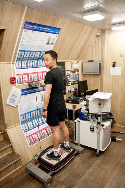 Wang Yue trains in the gym on vibration platform