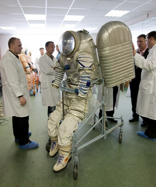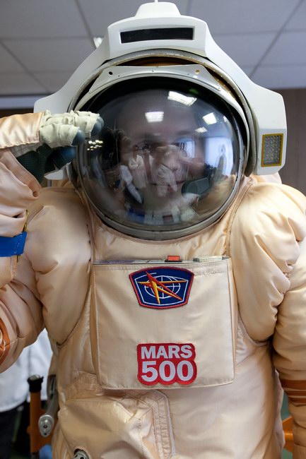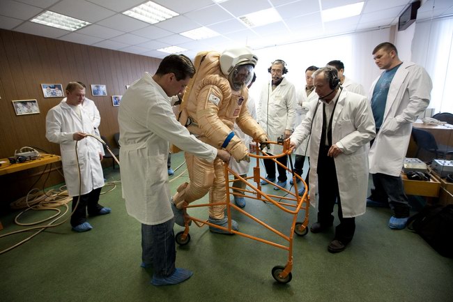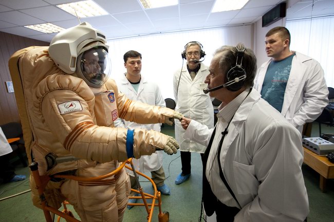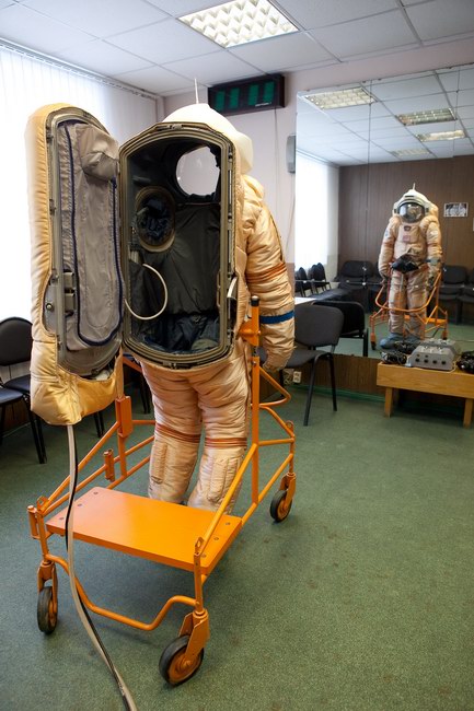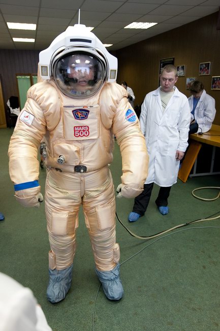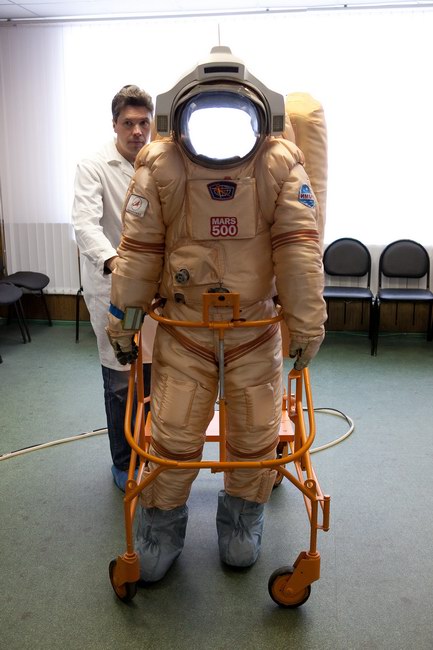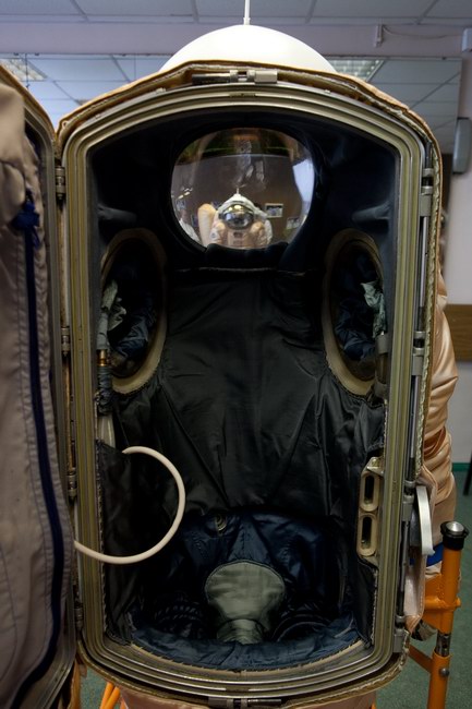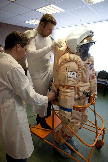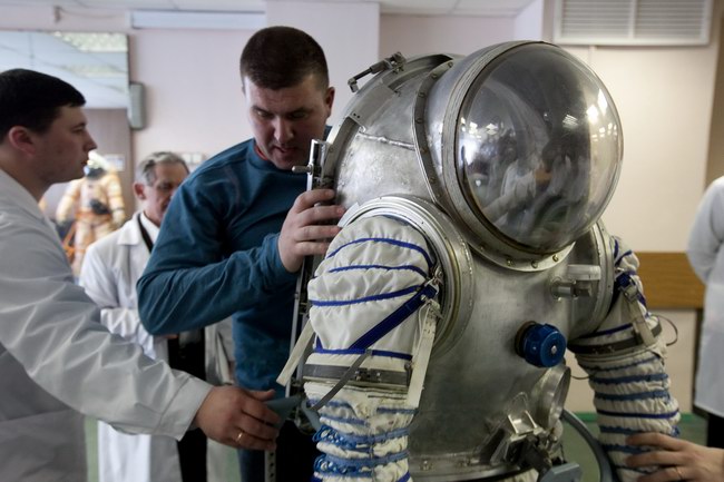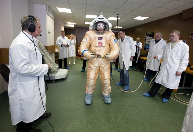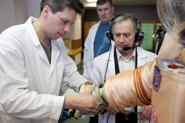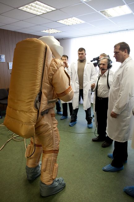 Trying on "Orlan-E" space suit