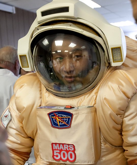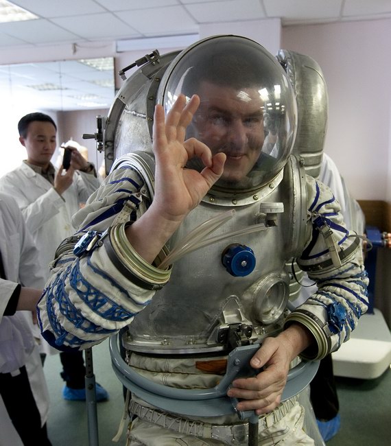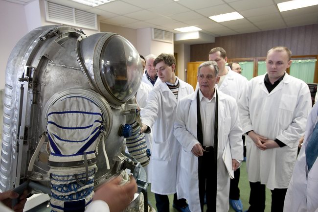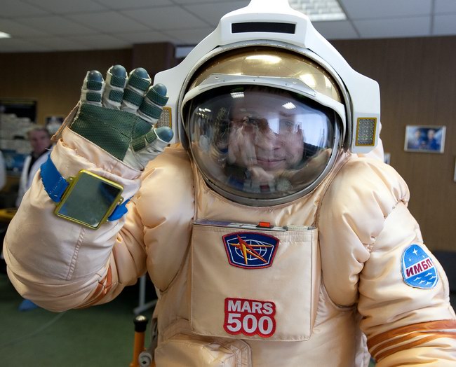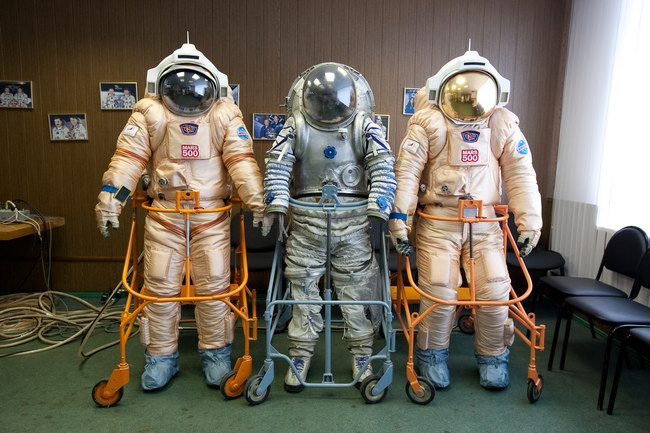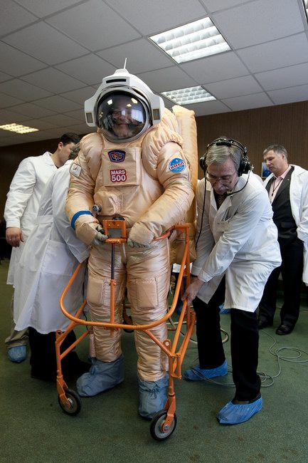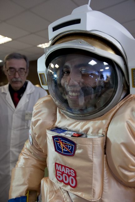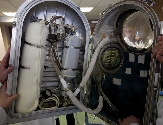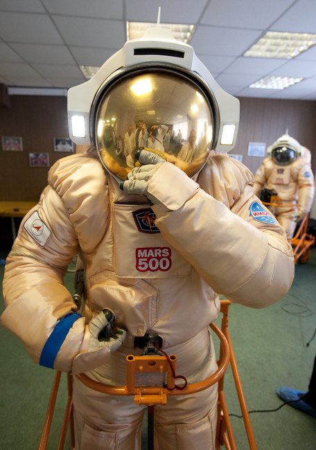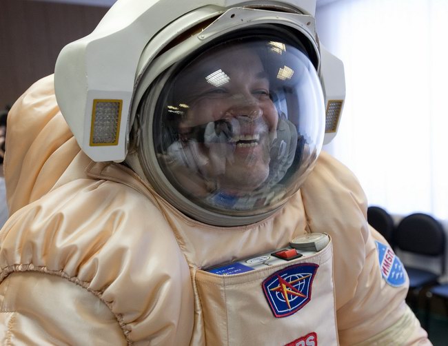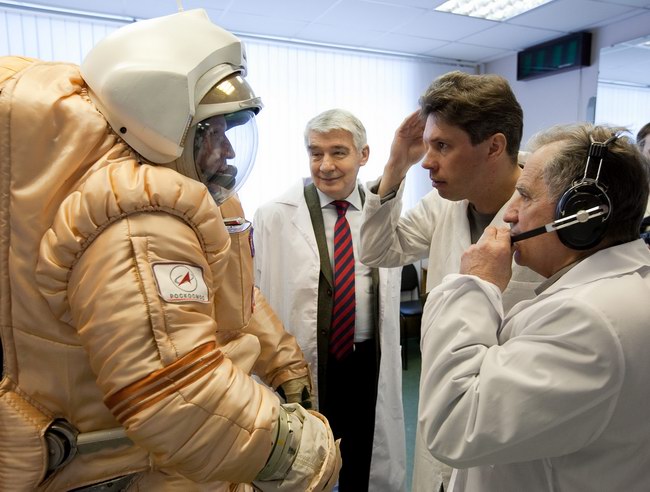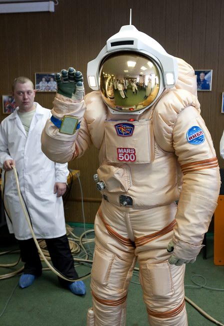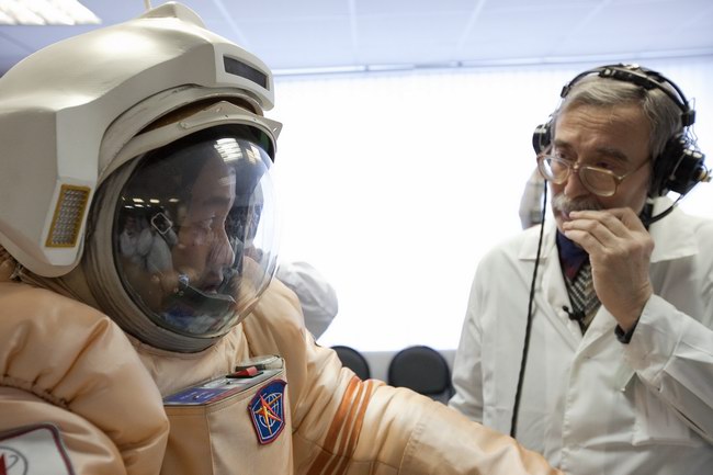 Trying on "Orlan-E" space suit