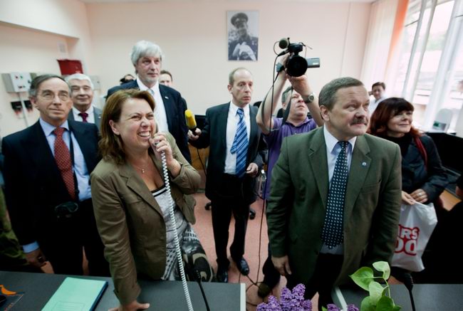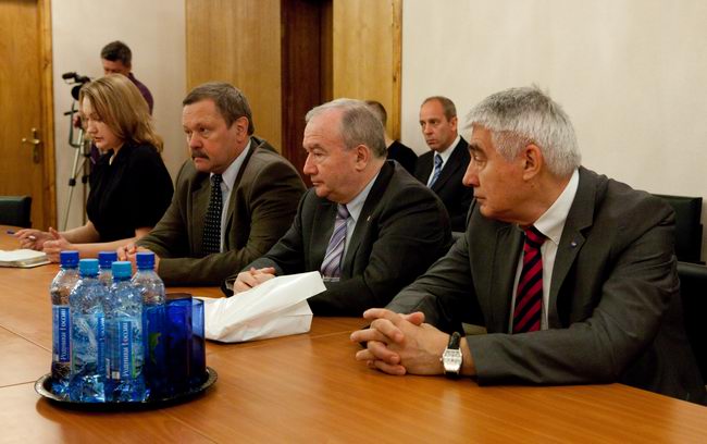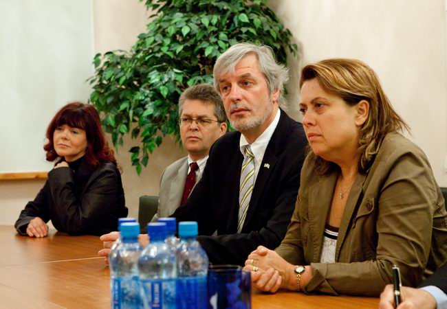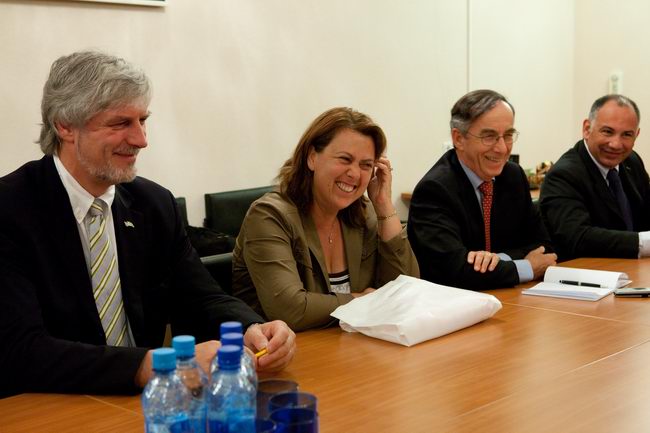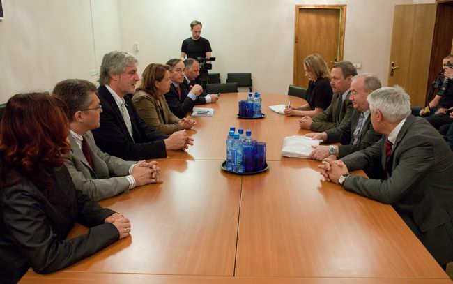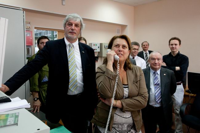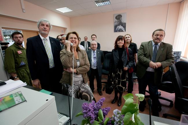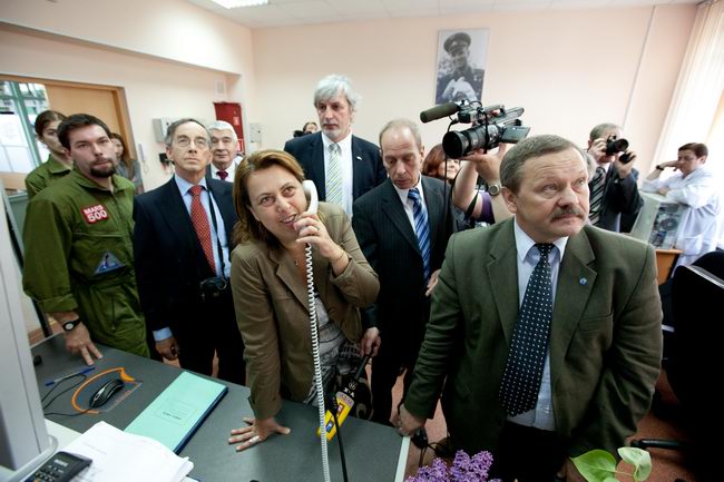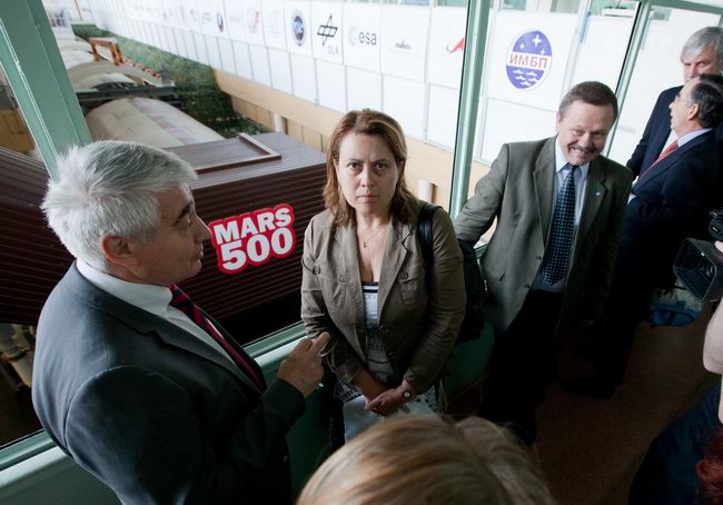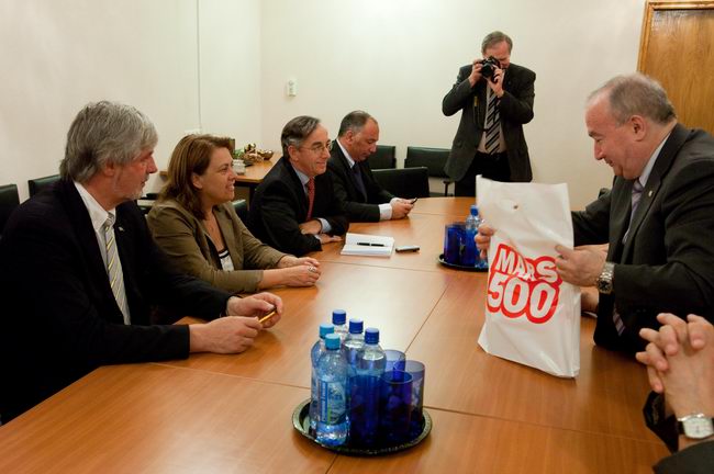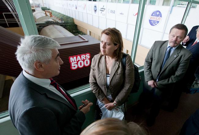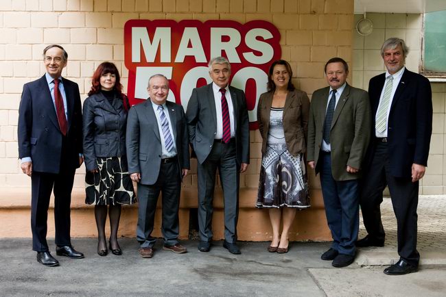 Слева направо: Роберт Велдхузер (Robert Veldhuyzen) (ЕКА); Елена Файхтингер (Elena Feichtinger) (ЕКА); Марк Самуилович Белаковский, зам. директора проекта "Марс-500", главный менеджер (ИМБП); Евгений Павлович Демин, технический директор проекта "Марс-500" (ИМБП); Симона Ди Пиппо (Simonetta Di Pippo), директор программ пилотируемых космических полетов ЕКА; Борис Владимирович Моруков, заместитель директора ИМБП, директор проекта "Марс-500"; Мартин Целл (Martin Zell), глава отдела пилотируемых полетов ЕКА.
