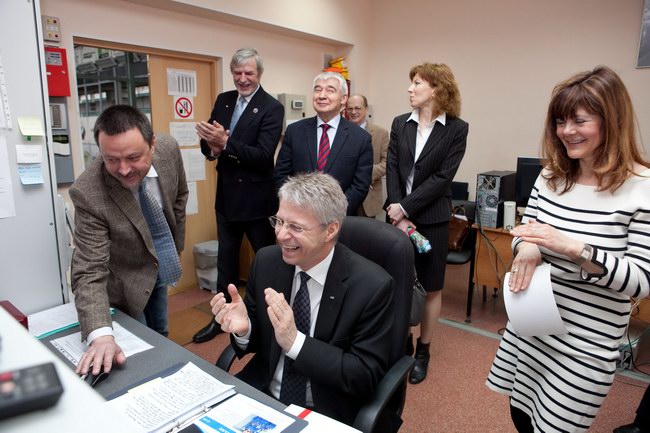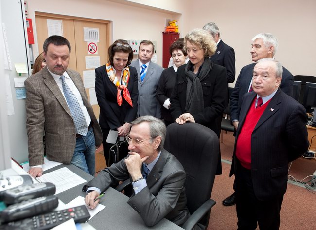 Томас Райтер (Thomas Reiter), астронавт Европейского космического агентства, новый директор директората пилотируемых полетов ЕКА, посетивший наземный экспериментальный комплекс с дружественным визитом, прослушивает поздравительное сообщение от экипажа 520-суточной изоляции.