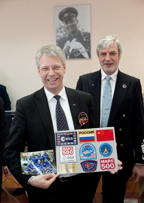 Томас Райтер, астронавт Европейского космического агентства, новый директор директората пилотируемых полетов ЕКА, и Мартин Целл, руководитель отдела исследовательских операций на МКС (ЕКА) в центре управления "марсианским" экспериментом. В руках у Томаса - сувенирный набор символики "Марс-500" и нашивок участников проекта.