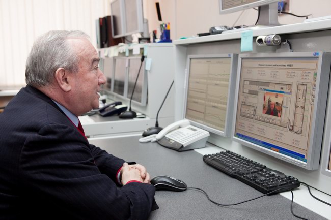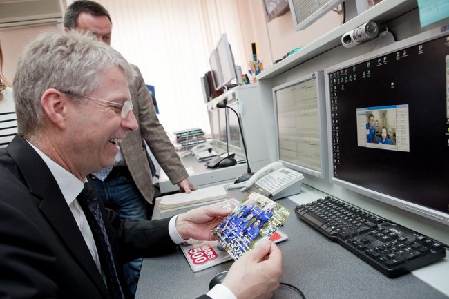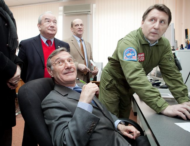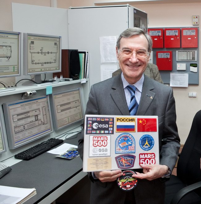 Янник Д'Еската (Yannick d`Escatha), генеральный директор космического агентства Франции (CNES) в центре управления "марсианским" экспериментом. В руках у Янника - сувенирный набор символики "Марс-500" и нашивок участников проекта.