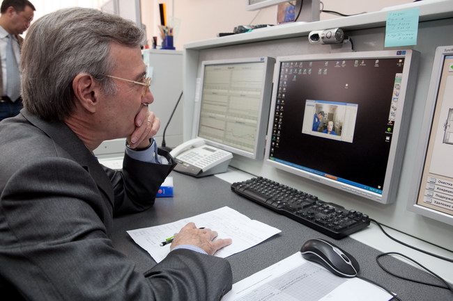 Янник Д'Еската (Yannick d`Escatha), генеральный директор космического агентства Франции (CNES), посетивший наземный экспериментальный комплекс с дружественным визитом, прослушивает поздравительное сообщение от экипажа 520-суточной изоляции.