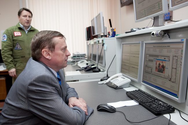 Томас Райтер (Thomas Reiter), астронавт Европейского космического агентства, новый директор директората пилотируемых полетов ЕКА, посетивший наземный экспериментальный комплекс с дружественным визитом,, прослушивает поздравительное сообщение от экипажа 520-суточной изоляции.