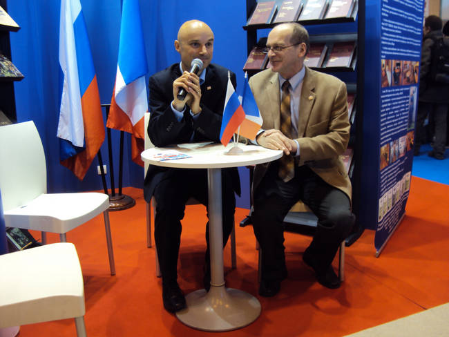 А.Суворов и Сирилл Фурнье (участник эксперимента "Марс-105") на выставке "Эксоланг" в Париже (01-04 февраля 2012 г)