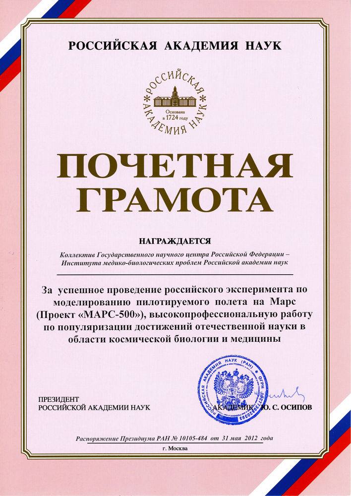 31.05.2012 коллектив ГНЦ РФ-ИМБП РАН был награжден почетной грамотой Российской академии наук за успешное выполнение российского эксперимента по моделированию пилотируемого полета на Марс (проект "Марс-500"), высокопрофессиональную работу по популяризации достижений отечественной науки в области космической биологии и медицины.