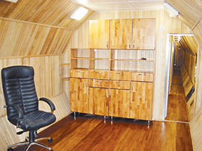 В жилом, единственном готовом на сегодняшний день, находятся индивидуальные каюты. Это маленькие комнаты размером 3 квадратных метра. В них расположены лежак, тумбочка для вещей и столик.