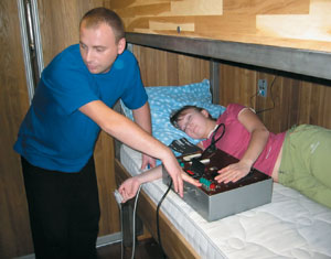 Ковалев Александр Сергеевич 1982 г.р., инженер, работает в лаборатории телемедицины ИМБП. Окончил МАИ по специальности «Инженерное дело в медико-биологической практике», участвовал в экспериментах по изучению влияния моделированных эффектов микрогравитации на организм человека. Область научных интересов – влияние экстремальных условий среды обитания на кардиореспираторную систему организма.