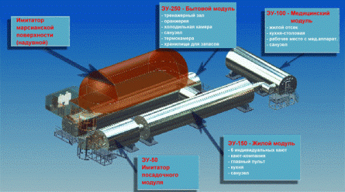 Эксперимент будет проводиться в наземном экспериментальном комплексе (НЭК) ГНЦ РФ-ИМБП РАН, состоящем из 5 герметичных сообщающихся между собой модулей суммарным объемом 550 куб. м., один из которых предназначен для имитации деятельности на "поверхности Марса". В модулях предусмотрены индивидуальные каюты членов экипажа, кают-компания, рабочие места для проведения медико-биологических исследований, помещение для хранения расходуемых запасов и т.п. Модули оснащены системами аудио- и телевизионной связи.